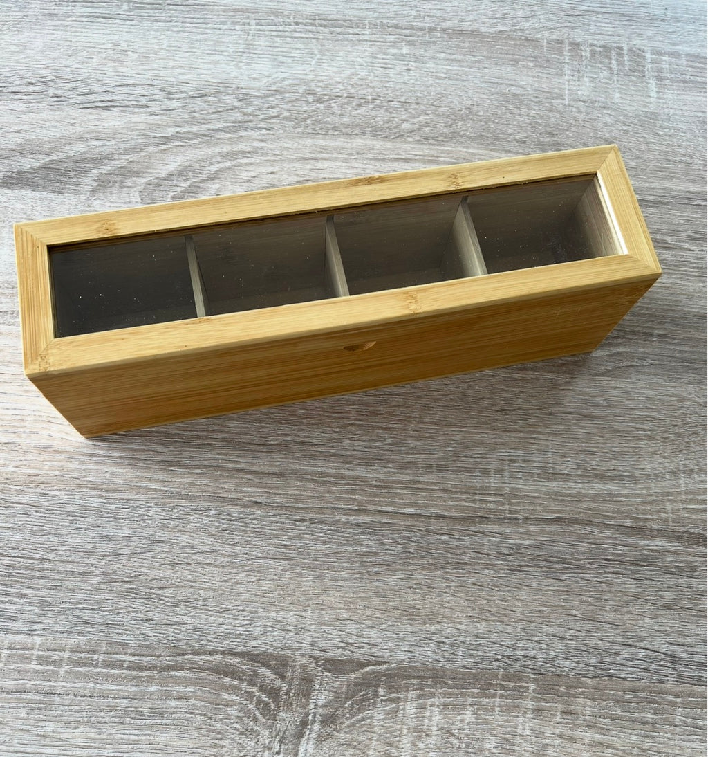 Boîte pour le thé en bambou, avec du verre sur le dessus. Il comprend 4 compartiments pour stocker différents types de thé.