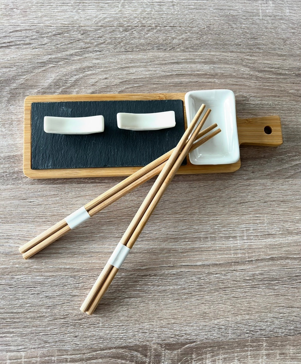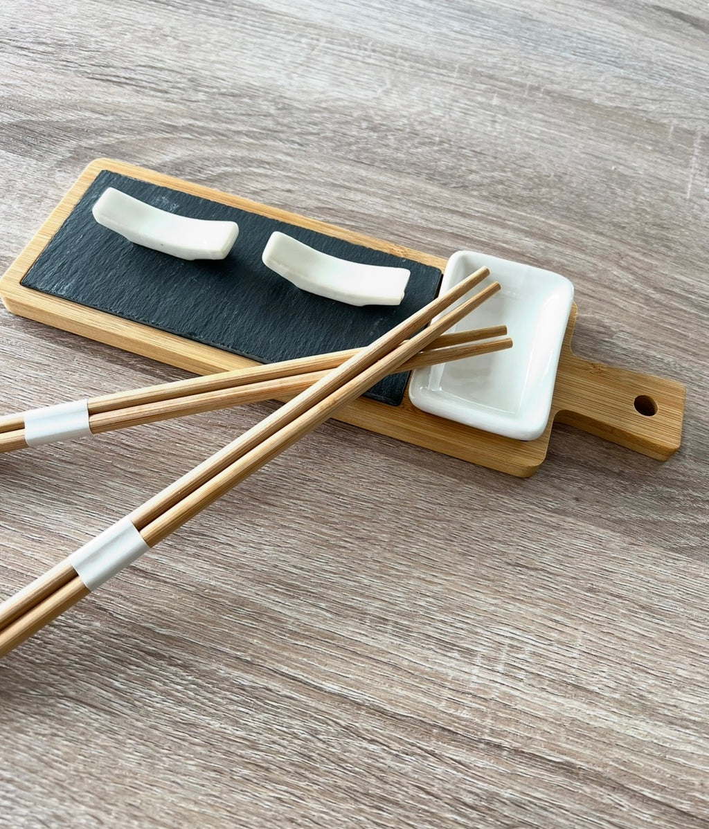 Service à sushi 6 pièces haut de gamme, en bambou et ardoise naturelle, idéal pour le service ou la présentation. Comprend une planche de présentation en bambou en combinaison avec de l'ardoise naturelle, 2 jeux de baguettes en bambou naturel avec supports en céramique et un bol en céramique.